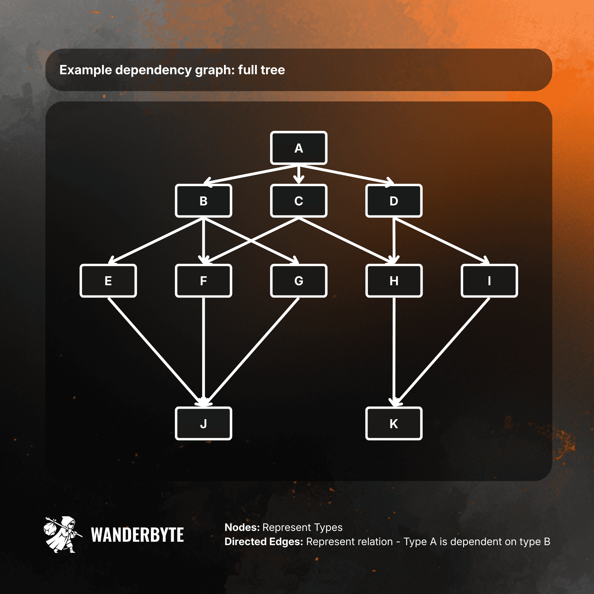 Each type defined in the game code can be represented as a node. Edges symbolize dependencies among the types. If type A refers to type B and its execution flow depends on B's state, we say Type A is dependent on type B. In a perfect world, the graph should resemble a tree. Just looking at the type, we can count and estimate how dependency-heavy it is.